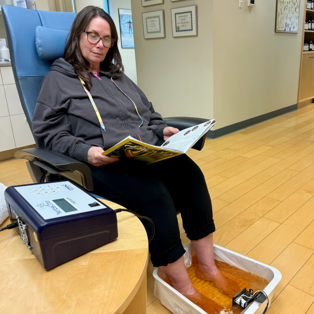 The use of ions. Painless, non-invasive ionic foot bath uses biocompatible electrical frequencies to facilitate total body detoxification. Ionized water begins an initial draw of toxins from the body into the water. The detox process is upregulated and elimination of toxins continues in the days following an IonCleanse.